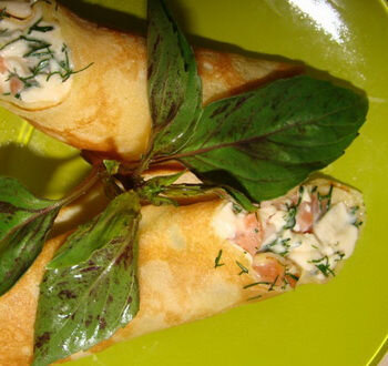 Блины с семгой являются невероятно желанной и популярной закуской на любом праздничном столе. Пусть даже это блюдо не из самых дешевых, но его нежность, сочность и отличное сочетание продуктов поистине стоят того, чтобы радовать нас хоть иногда. Блины с семгой отлично и красиво смотрятся на любом столе. Будь то традиционный семейный ужин, рабочий корпоратив или праздничный стол. Блины с семгой относятся к универсальным блюдам, которые отличаются простотой и легкостью приготовления и потрясающе нежным вкусом. Для того чтобы немного удешевить рецепт этого блюда, можно использовать семгу домашнего приготовления. В любом случае, вы сможете приготовить семгу в домашних условиях в полном соответствии со своими личными вкусовыми предпочтениями и однозначно, она получится гораздо вкуснее, нежнее и ароматнее, нежели покупная. Ингредиенты: 😟 Не подходят? Подберите другой рецепт в категории «Блины»! 😉 Рецепт: Шаг 1: Готовим блины. Шаг 2: Готовим начинку. Шаг 3: Заворачиваем блины. Шаг 4: П