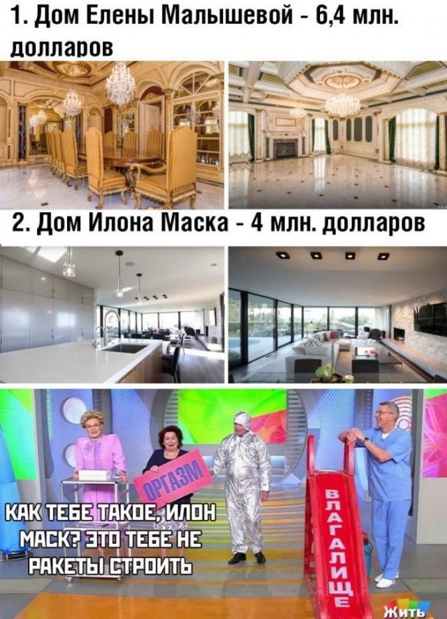Елена Малышева - российская телеведущая, врач-терапевт, кардиолог, педагог, доктор медицинских наук, профессор, общественный деятель. Руководительница и ведущая телепрограмм «Здоровье» (с 3 октября 1997 года) и «Жить здорово!» (с 16 августа 2010 года), выходящих в эфир на «Первом канале». Профессор Московского государственного медико-стоматологического университета И так давайте перенесемся на границу штатов Нью Йорк и Нью Джерси на побережье реки Гудзон. Общие данные: Пригород Нью Йорка , 6,4 миллионов долларов, 1100 кв. метров, 21 комната Немного колониального стиля в убранстве особняка, грандиозная лестница, чернокожие мальчики-лампы. В доме 21 комната, несколько ванных, отделанных мрамором. На первом этаже располагается гигантская столовая и гостиные. Весь интерьер выполнен в стиле барокко. Обставлены комнаты антикварной мебелью, а потолки украшают гигантские хрустальные люстры. Потолки в два этажа, колоны, лепнина, камин, и все, разумеется, блестит золотом. В кабинете Елены Малы