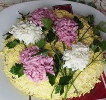 Украшаем салат сиренью. Для этого нам нужен натертый белок, зелень и красная капуста. Салат готов к употреблению. Приятного аппетита!
