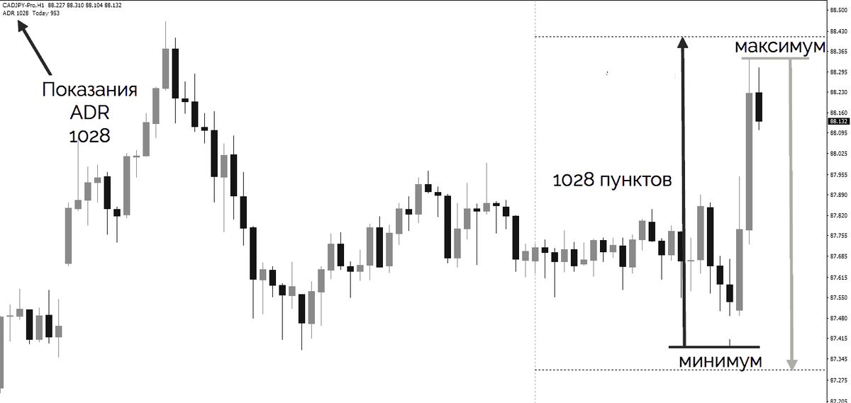 В большинстве случаев вы увидите дополнительный текст со значениями индикатора на графике. Индикатор ADR показывает вам среднюю волатильность за n периодов.