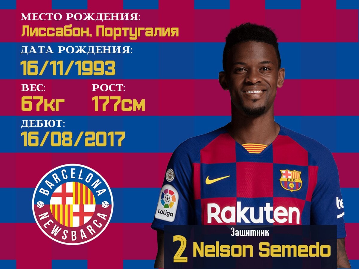 Нельсон Кабрал Семеду родился 16 ноября 1993 года, присоединился к Бенфике в 2012 году из Шентренше. Он вернулся на правах аренды в свой бывший клуб. Блестяще выступал за вторую команду Бенфики, он дебютировал в матче Суперкубкак Португалии против Лиссабонского Спортинга. За два сезона с первой командой Семеду сыграл в 63 матчах, в том числе одиннадцать в Лиге Чемпионов. В самом успешном португальском клубе он выиграл два чемпионата, один Кубок, один Кубок Лиги и один Суперкубок. 14 июля 2017 года он был представлен в качестве нового игрока Барселоны. Он дебютировал за сборную Португалии 11 октября 2015 года и был в команде, которая финишировала третьей на Кубке Конфедераций 2017 года в России, сыграв в двух матчах за свою сборную. Copyright FC Barcelona Official
