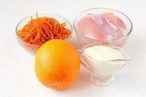 Соединить апельсин, морковь по-корейски, куриное филе, майонез.