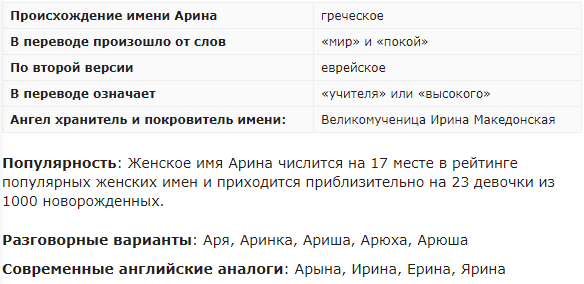 Женское имя Арина по происхождению древнегреческое. Произошло от древнегреческих слов, трактующихся как «покой» и «мир». Может быть устаревшей формой современного имени Ирина. Ранее особым спросом не пользовалось, но сегодня его популярность ежегодно растет. Главной чертой энергетически сильных носительниц имени Арина считается самостоятельность. Арины, как правило, это независимые, непоседливые и свободолюбивые дамы. Они мудрые и требовательные, решительные и умные, активные и общительные, обаятельные и красноречивые. Со всеми людьми одинаково добры и приветливы, не разделяют их на неважных и важных. СМОТРИТЕ ВИДЕО - ПОДРОБНЕЕ ТУТ Источник - Значение имени Арина: карма, характер и судьба
