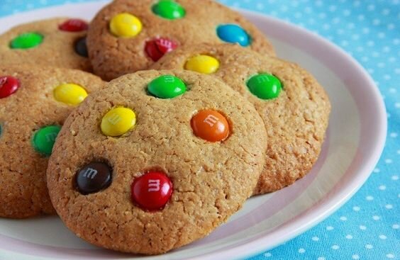 • Делаем из готового теста с M&M`s шарики, затем пальцами либо чем вам удобно придавливаем, чтобы получились печеньки. Украшаем сверху оставшимися драже.