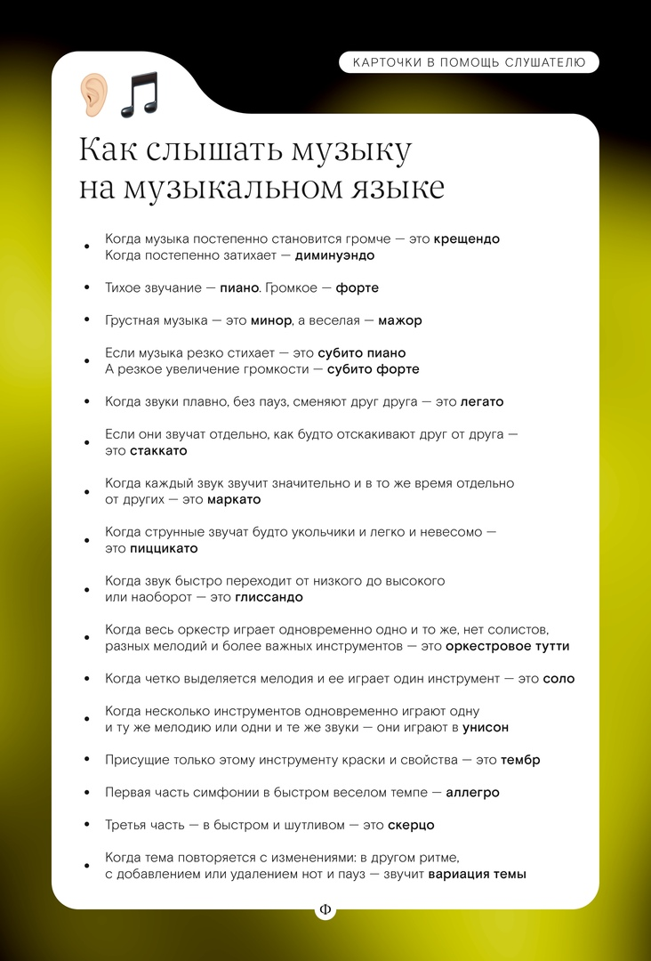 Эта карточка с примерами поможет слышать музыку на музыкальном языке. То есть проще читать музыкальную критику, интервью с музыкантами, музыковедческие книжки, понимать лекции и говорить на концерте шепотом: «ну что за скерцо!, да?». В памятке часто употребляемые обозначения, которыми обычно описывают музыку. Ниже — примеры из наших концертов. Ссылки ведут на нужные моменты в записях наших трансляций. Сами по себе эти моменты не важны, послушайте чуть до и чуть после. Открывайте с компьютера, в приложении не получится. Удобно поглядывать во время трансляции или перед концертом в зале, когда нас всех будут пускать в залы. • крещендо: vk.cc/atqtBW, vk.cc/atqwTM, vk.cc/atqz6Z