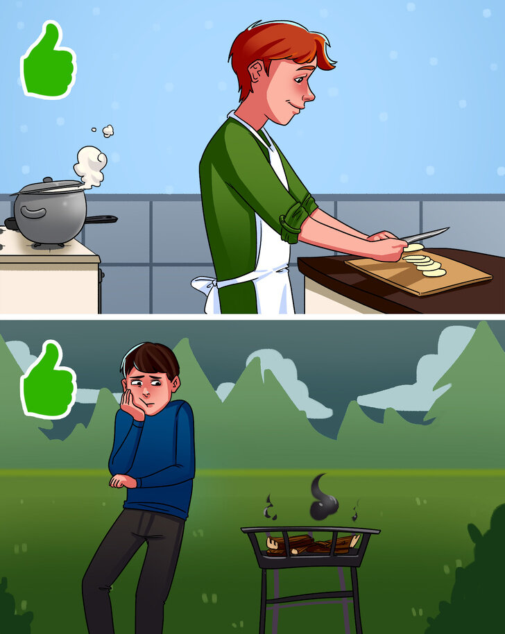 «Мужику не место на кухне, но вот шашлык готовить должен только он. Не знаешь, как разжечь огонь в мангале? Не мужик!» «Настоящий мужик должен проводить выходные в спортбаре с друзьями. Смотришь с женой сериальчики? И любовь там есть? Все, тебя из списка вычеркиваем» «Если жена получает больше тебя, ты не мужик. Кто больше зарабатывает, тот и главный» «Мужик от природы полигамен. Устроены мы так, понимаешь, Маш?» «Начинай защищаться, даже если еще не напали, даже если ты один против десятерых. Переломы, порезы, синяки — все это только украшает настоящего мужика» «Ты должен уметь собирать мебель, менять унитазы, копать со скоростью экскаватора. Батя в детстве не научил, что ли?» «Ну и что, что вы были вместе 10 лет? Перестань ныть и найди ей замену. А лучше две» «Как-как ты сказал? Увлажняющий крем? Чего-чего для укладки волос? Бабские штучки» «Настоящий мужик должен есть мясо. С картохой. Пузо — это святое» «У настоящих мужиков есть только одно чувство — это чувство голода. И вообще,