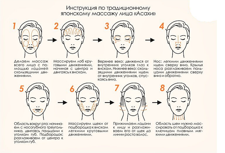 Если вы хотите самостоятельно освоить тонкости выполнения массажа асахи, то спешим вас заверить, что это несложно. Сегодня виды современного массажа действительно достаточно разнообразны, но асахи успел завоевать особенное признание и любовь. ⠀ Перед тем как приступать к выполнению массажа обязательно очистите кожу лицу и подберите масло, которое поможет вам воздействовать на нужные участки и при этом не травмировать кожу. Плюс ко всему, масло подарит вашей коже увлажнение и дополнительное питание. ⠀ Как сделать японский массаж асахи самостоятельно 🙌🏻 ⠀ Для достижения видимых результатов массаж необходимо выполнять ежедневно перед сном в течение 10 минут. И запомните, что только регулярность подарит вам молодость, красоту и здоровье. Для того, чтобы понять и освоить технику выполнения массажа мы рекомендуем вам посмотреть видео-урок, в котором будет показан поэтапный процесс выполнения массажа. ⠀ Японский массаж лица от морщин включает в себя проработку следующих зон: ⠀ Укрепление л
