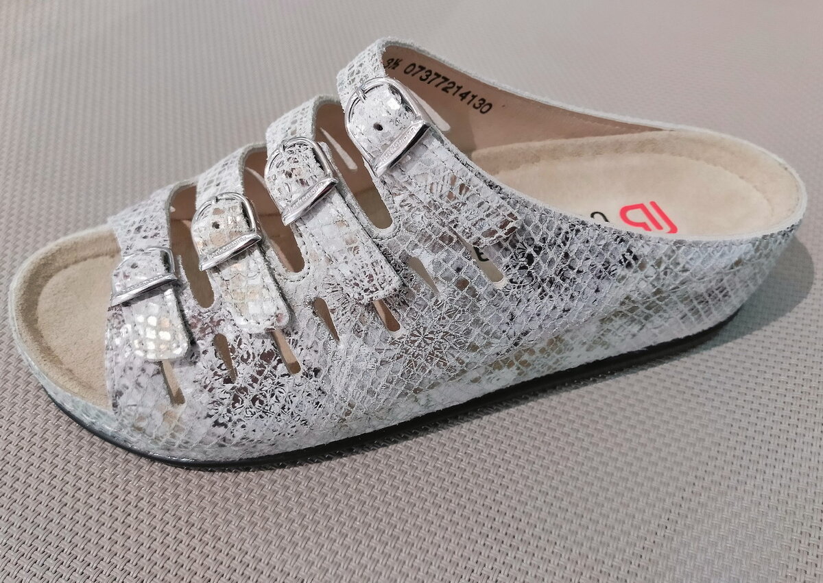 Четыре длинных кожаных ремешка с надежными “липучками” делают данную модель доступной даже для ног с выраженным отеком, высоким подъемом или деформациями суставов.