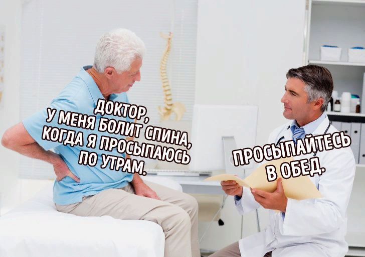 Вернёмся. Наш организм расслабляется. И делает он это вместе с нашей поясницей. Наша поясница, желая также отдохнуть (имеет право!), чтобы наверняка, приковывает нас к кровати. Она просит, чтобы её оставили в покое!
