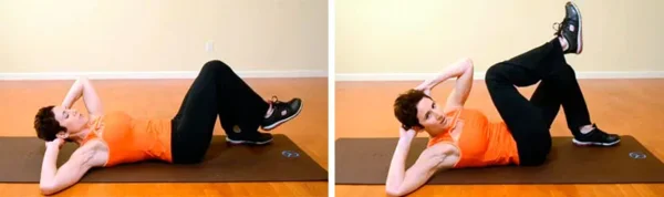 В положении сзади мы стараемся коснуться левого колена правым локтем, рукой за голову. Нога должна быть согнута и неподвижна, и мы, конечно, не опускаем ее на пол, потому что только в этом случае упражнение будет эффективным. Другая рука находится за головой или на животе, что позволяет вам почувствовать работу мышц. Старайтесь поддерживать амплитуду ваших движений.
