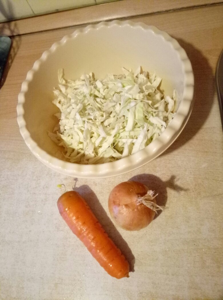 Капусту шинкуем, морковь натираем на крупной терке, лук мелко режем.