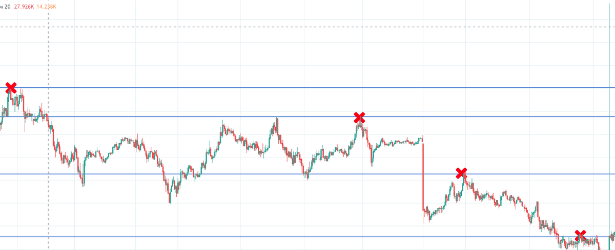 27 апреля в самом начале вечерней торговой сессии можно заметить довольно высокую "тень" свечи, превышающую среднюю рыночную стоимость почти на 30%. Интересно, что же там произошло? По словам Василия Коновалова, подавшего жалобу на данную "шпильку"(правый нижний угол), речь идет о спланированной манипуляции путем ценовой атаки. Казалось бы, ну чего вы пристали к этой несчастной шпильке? Дело в том, что всего за несколько секунд Московская биржа исполнила 47 000 контрактов, а это, на минуточку, больше 750 млн рублей. Вероятно, один крупный игрок заметил, что как-то многовато стало шортистов, не верит никто в нефть нынче, и решил показать им кузькину мать. На графике выше я отметил наиболее наглядные места для выставления стоп-лоссов при торговле в шорт. Если присмотреться к крестикам, то можно заметить, что если выбить самых первых шортистов по стопам (крайний левый крест), то они автоматически выбьют всех остальных по-очереди, как домино. А цена, соответственно, как по взмаху волшебн