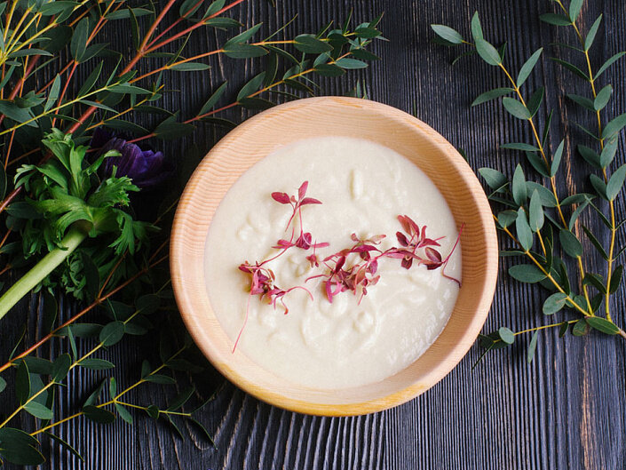 Состав: Приготовление: Порезать морковь для чипсов на тонкие кусочки. Подсушить в дегидраторе или духовке 5-7 часов на 42 С. Орешки, замоченные на ночь, очистить. Миндаль, цветную капусту, специи и воду взбить в блендере до кремового состояния, добавляя воду постепенно до нужной густоты. Украсить суп чипсами из сушеных кусочков овощей и рукколой. Подавать с миндальными орешками. Славной трапезы!