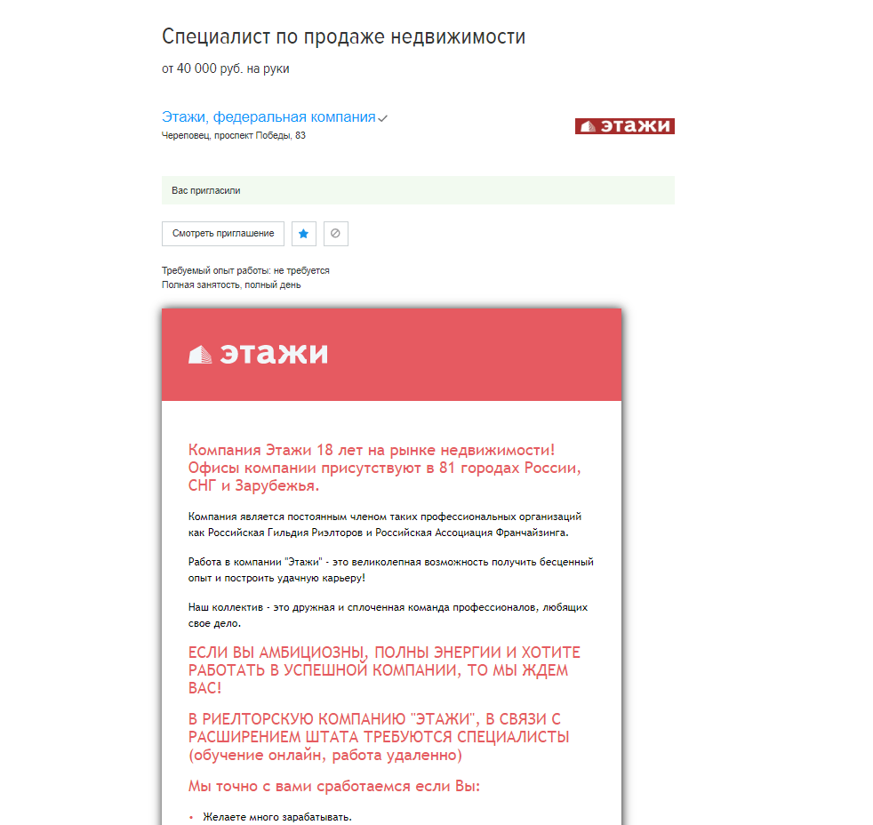 Всех приветствую, долго не выходил на связь, но на это были свои причины. Сегодня расскажу о том, как я нашел вакансию в риэлторскую компанию "Этажи" Подстигло оставить резюме меня то, что было написано возможно без опыта работы, да и зарплата, которая была указана в объявлении для работника без опыта, весьма солидная, однако меня сразу эти факты насторожили, но попытка не пытка - подумал я. На следующий день мне позвонила менеджер по персоналу, у нее была поставленная и приятная речь. Так все красиво звучало: "Мы предоставим нашу клиентскую базу, вы будете продавать квартиры нашим клиентам, все зависит только от ваших способностей, полное обучение за наш счет, после 6 месяцев, когда вы наберете свою клиентскую базу, то мы оформим вам ИП и вы будете независимым риэлтором и т.д. Конечно, на словах все это красиво, но в наше время я не очень верю таким речам, ведь кому нужно возиться с 18 летним парнем без опыта работы, вроде меня?? Вариантов два : либо меня будут сначала питать надежд