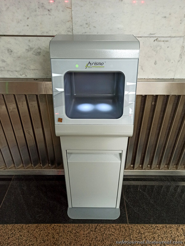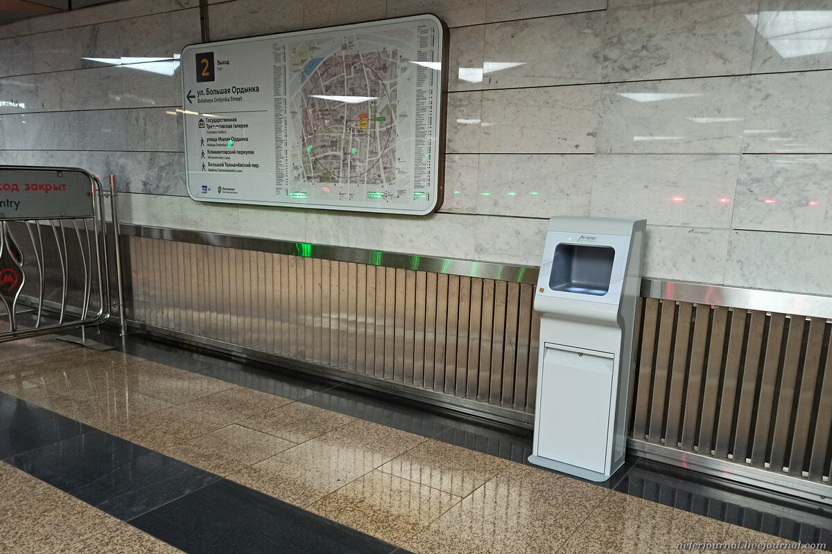 В первый день диспенсеры с антисептиком установили на станциях Щелковская, Комсомольская-кольцевая и в двух вестибюлях станции Белорусская. Вот дошла очередь до Третьяковской. В общей сложности обещают больше ста. На станциях с увеличенным пассажиропотоком количество автоматов будет больше. Мне интересно, что за жидкость внутри, нигде не указан ни производи