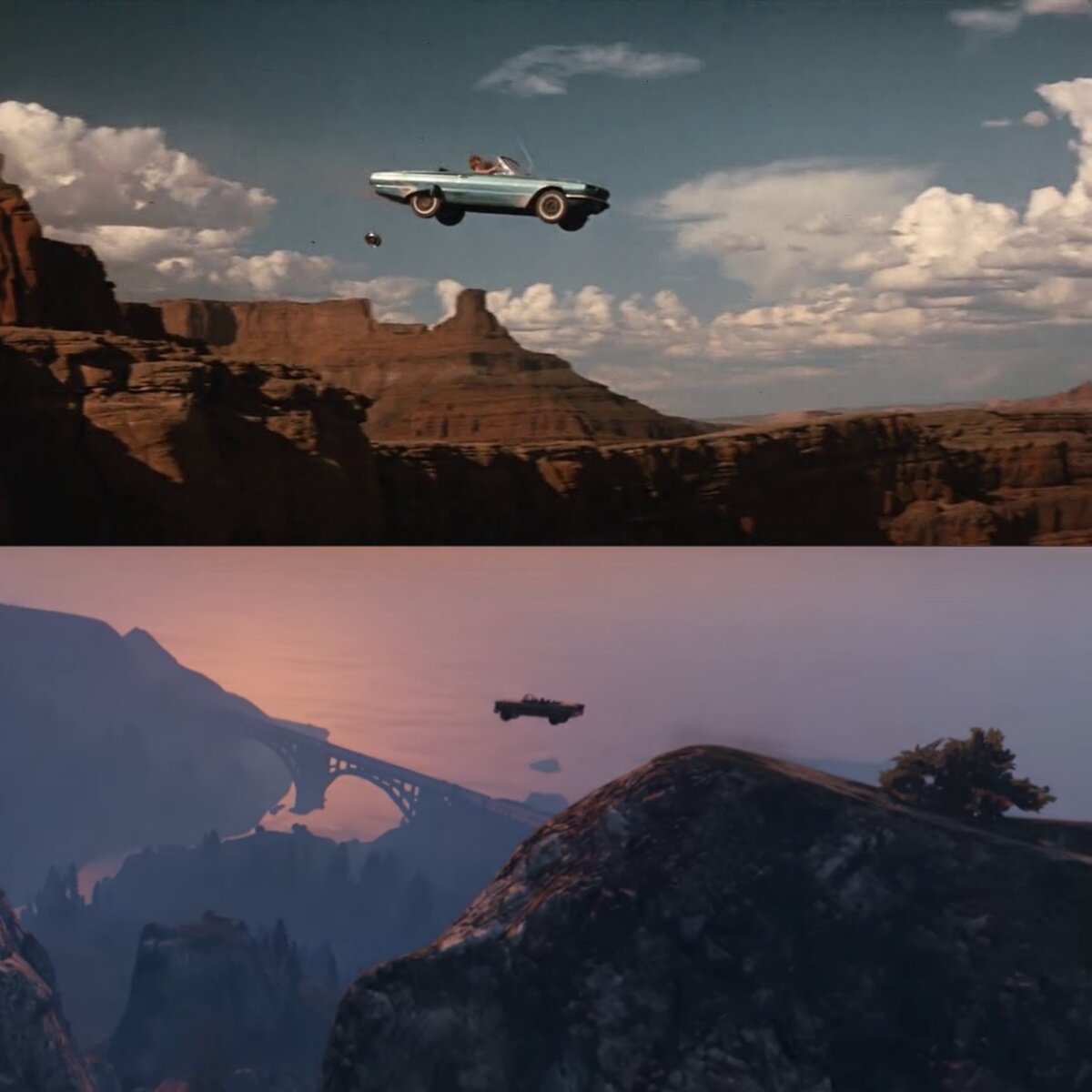 В огромном мире GTA 5 существует большое количество пасхалок и отсылок на различные интересные фильмы и сериалы. Об одном из них сегодня и пойдет речь. В 1991 году вышел фильм Тельма и Луиза, ставший классикой американского кино. В фильме есть момент в котором машина главных героев падает с обрыва и разбивается. Этот момент стал культовым, настолько, что его взяли в качестве одной из сцен в игре GTA 5. Если игрок придет на определенное место на горе во время заката, то сработает та самая пасхалка к фильму и мы увидим как старый кабриолет с двумя девушками на борту падает со скалы и разбивается. Прямо как в фильме.