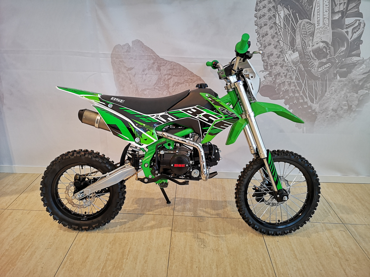 Всем привет, с вами Питбайк клуб! Каждый человек, более или менее посвященный в мир питбайков знает, ну или 100% слышал о такой классике жанра, как линейка BSE PH. Сегодня мы расскажем про этот питбайк в первую очередь тем людям, которые только присматриваются к выбору своего первого пита. И так, встречайте! Перед вами BSE PH10-125e — это 125-ти кубовая модификация всем известного питбайка, обладающая фарой головного света, электростартером и колесами 17/14 дюймов. Компания BSE была основана в 2002 году и на сегодняшний день имеет за спиной огромный опыт в производстве эндуро техники, и в частности питбайков. Техника BSE продается практически по всему миру. Линейка PH выпускается уже около десяти лет. За это время производитель сумел избавить модель от всех детских болячек и оснастить ее самыми современными и нужными компонентами. Сейчас мы расскажем о них подробнее. И так, представленная модель имеет современный, агрессивный внешний вид и ярко-зеленую раму. Байк очень легкий, сухой в