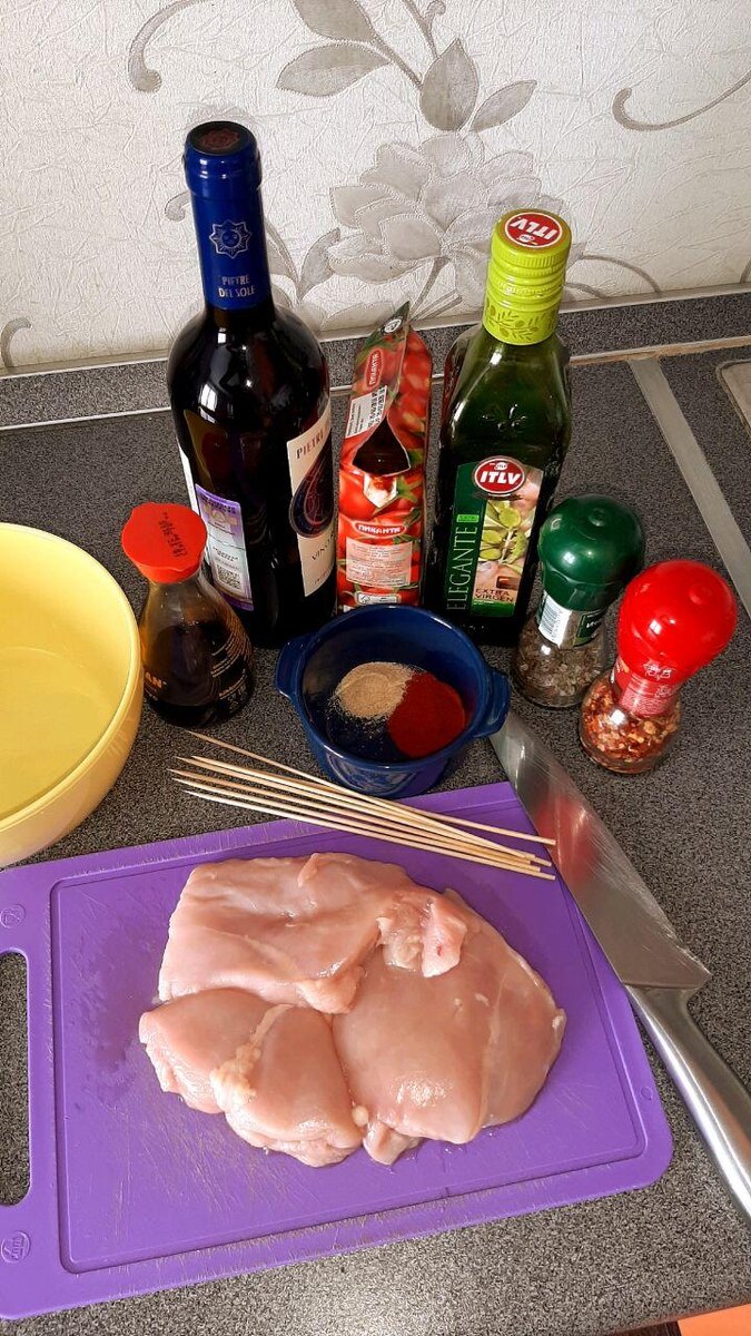 Мало кто знает, что современные духовые шкафы обладают огромным количеством функций, но мы как правило используем лишь малую часть. Я всегда советую обращать внимание при покупке духовки на наличие полезного и даже необходимого режима работы - конвекция! Конвекцией является перемещение тепла потоками воздушных масс внутри духовки. В процессе происходит обмен холодными и теплыми воздушными массами, их перемешивание, в результате чего температура внутри печи становится одинаковой и равномерной по всему объему замкнутого пространства. Именно в режиме конвекция мы будем вялить мясо, но для начала его нужно подготовить. Для этого нам понадобится: ШАГ 1: Нарезаем грудки на тонкие полоски и перекладываем в глубокую чашу. ШАГ 2: Добавляем к мясу специи, соевый соус, вино, протертые томаты и оливковое масло. Тщательно перемешиваем и оставляем мариноваться 30 минут. ШАГ 3: Насаживаем мясо на деревянно-кухонные шампуры и перекладываем на решетку для духовки. ШАГ 4: Ставим в заранее разогрету