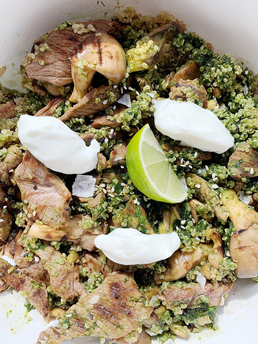 Майские застали вас дома? Устройте барбекю, не выходя из квартиры. Когда во время майский праздников вы зададите вопрос "Что сегодня на ужин?», вспомните про этот рецепт. Пряный вкус приправ, киноа, пропитанное соком грибов и говядины-гриль, делают это блюдо возмутительно весенним. Легкий и холодный йогурт оттенит сытный стейк и крупу, а сок лайма взорвет на ваших вкусовых рецепторах всю палитру свежести и весны. Майские пришли. Ура. Ингредиенты: Шаг 1 Поставьте вариться на медленный огонь киноа в соотношении 1 к 2. Пока крупа варится, разогрейте сковороду гриль и достаньте стейк из холодильника. Дайте мясу полежать и приобрести комнатную температуру. Затем смажьте стейк оливковым маслом для жарки и положите на сковороду-гриль. Обжаривайте по минуте с каждой стороны. Нарежьте тонкими кусочками.Переложите мясо в глубокую салатницу. Шаг 2 Пока мясо отдыхает, помойте вешенки. Разрежьте соцветие на отдельные грибы, удалите ножки и сбрызните их оливковым маслом для жарки. Используйте сковор