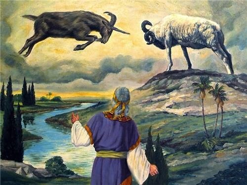 «[Козел] пошел на того овна, имеющего рога, которого я видел стоящим у реки, и бросился на него в сильной ярости своей. И я видел, как он, приблизившись к овну, рассвирепел на него и поразил овна, и сломил у него оба рога; и недостало силы у овна устоять против него, и он поверг его на землю и растоптал его; и не было никого, кто мог бы спасти овна от него».