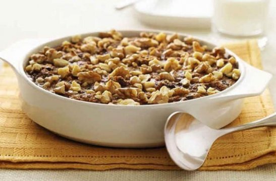 5 ст. ложек овсяных хлопьев, 5 ст. ложек воды, 1ст. ложка молока (или 1ч. ложка сливок), 1ч. ложка меда, 5 орешков (грецкие, фундук, миндаль).