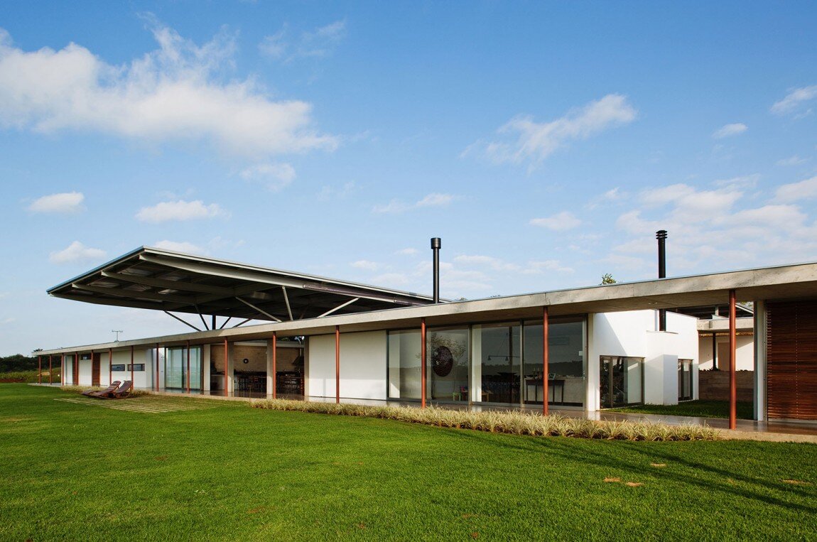 Этот современный одноэтажный дом построен на просторном участке на берегу водохранилища Avare в 250 км от Сан-Паулу. У него длинный последовательный план — все помещения расположены линейно и соединены друг с другом открытыми галереями. Такое сдержанное решение обусловлено в том числе особенностями скудного ландшафта. Оживляют план три сквозных разрыва, в которых находятся открытые террасы. Ещё один разрыв расположен в центре и перекрыт приподнятой плоской крышей — здесь расположена главная терраса, предназначенная для отдыха и общения. Название: Резиденция F.S. (Residencia F.S.)