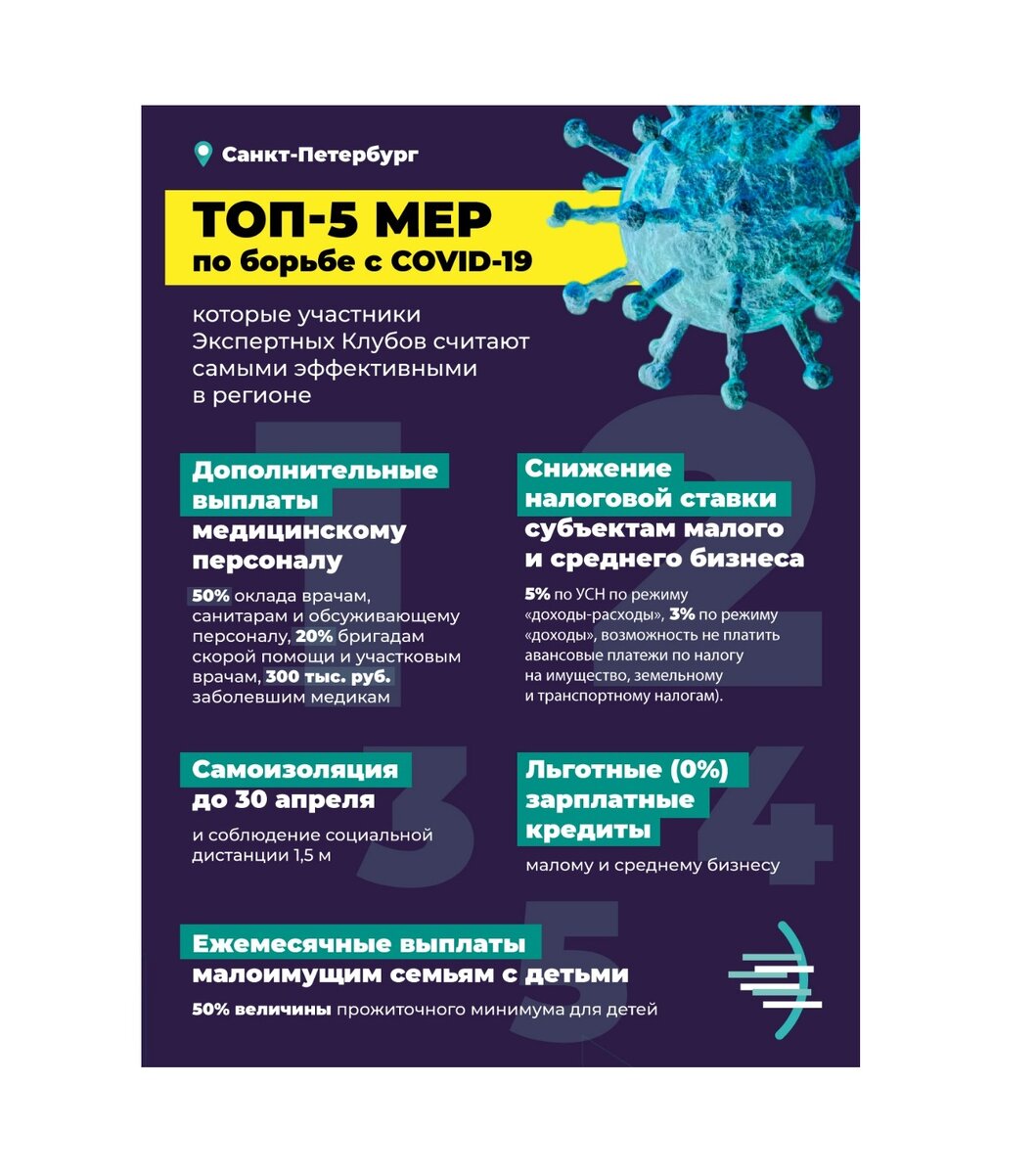 С момента начала эпидемии коронавируса в Санкт-Петербурге принимались меры, которые в разный период давали разный эффект. Участники Экспертного Клуба Петербурга назвали лучшие практики руководства города по борьбе с кризисом, вызванным эпидемией COVID-19. В городе сохраняются вплоть до 30 апреля все принятые ранее властями ограничительные меры. Кроме того власти региона уделяет особое внимание мерам поддержки бизнеса и сохранению рабочих мест, дезинфекции общественных пространств и транспорта, а также помощи врачам. Эксперты отмечают, что для решения задач в условиях пандемии власти используют рекомендации федерального центра и адаптируют их к петербургской реальности. «С первых дней стало понятно, что самые большие проблемы будут у среднего и малого бизнеса. Это тысячи Петербуржцев для них была существенно снижена налоговая ставка. Поддерживают и тех, кто на передовой - врачам выплачивается страховка. По мерам противодействию распространения в муниципалитетах есть четкий план. В каж