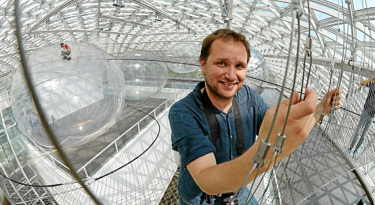 Вот у кого можно поучиться созданию масштабных инсталляций, так это у аргентинского художника Томаса Сарацино. В его шедеврах можно бродить, взлетать на орбиту и даже почувствовать себя пауком. Томас работает в направлении сайнс-арт – это некая смесь искусства и науки. А одна из самых известных его работ называется «На орбите» и находится в постоянной экспозиции музея современного искусства К21 в Дюссельдорфе (Германия). Именно про эту инсталляцию мы сегодня и поговорим. «На орбите» - это модель воспарившего над Землей города будущего. Экспозиция, которая сделана из стальной проволоки и сфер, занимает площадь 2500 кв.м. и действительно парит под стеклянным куполом музея. Инсталляция имеет 3 уровня и 5 наполненных воздухом огромных сфер. Посетители музея могут забраться внутрь: походить между сферами, прилечь на сетку и понаблюдать за людьми внизу, которые с 25-метровой высоты кажутся совсем крошечными. Одновременно «на орбите» могут находиться 10 человек. Инсталляция начинает работать