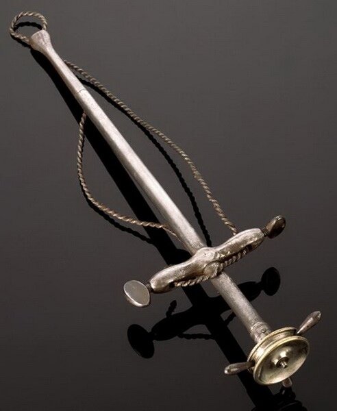 Стоматологический инструмент прошлого для удаления омертвевших частей языка. Регулируемая петля на конце этого "меча" служила для перетягивания, чтобы не допустить кровотечения.