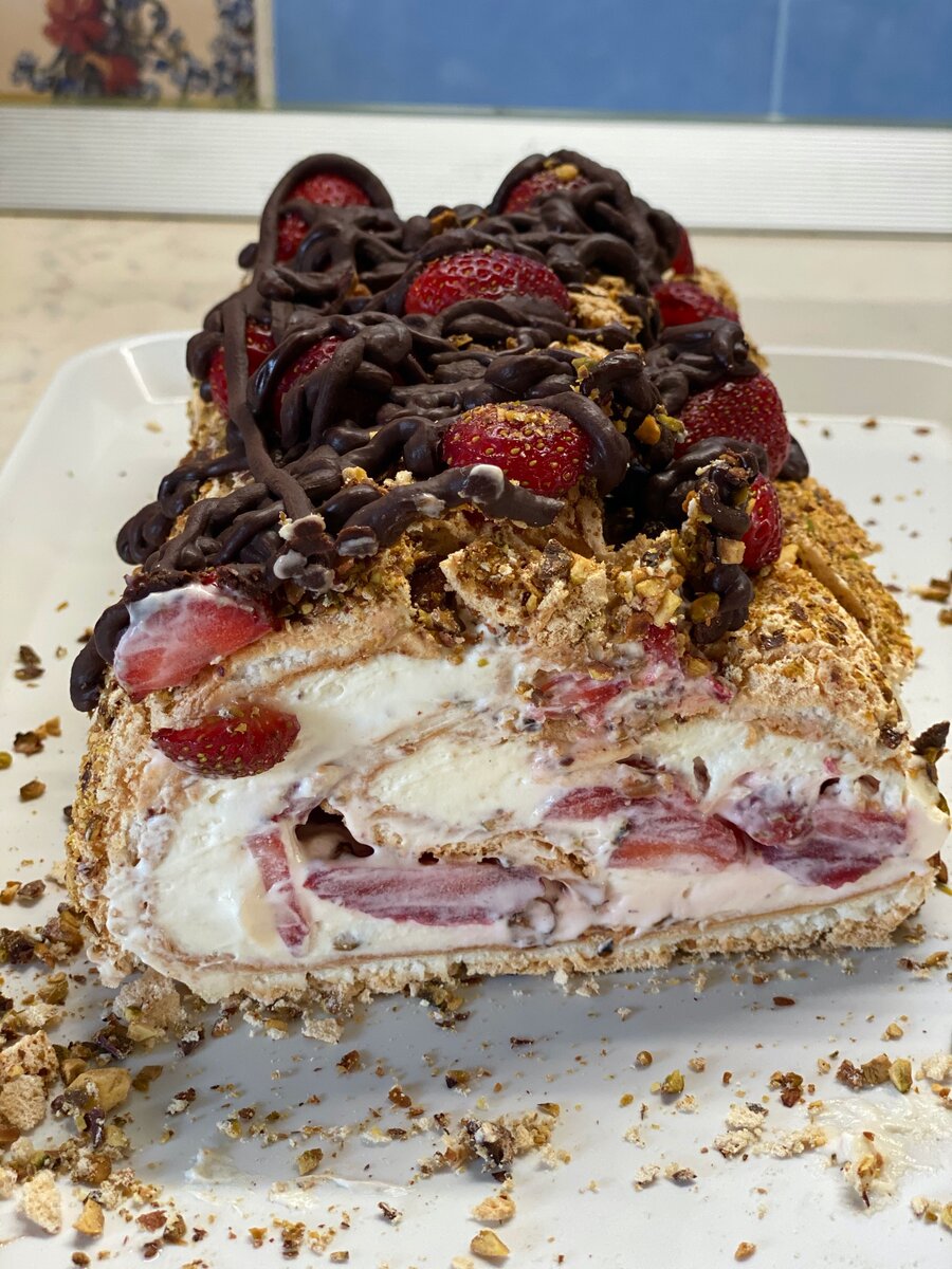 Воздушный и легкий рулет, который тает во рту. Это один из самых лучших десертов, что я готовил. Рулет выполнен по мотивам торта Павлова, который был так назван в честь балерины. Сам по себе торт - это меренга, взбитые сливки и свежие фрукты. Мы же пойдем дальше и сделаем из меренги рулет. В моем рецепте я осознанно уменьшил количество сахара, потому что не люблю приторно сладкие десерты. В связи с этим, меренгу приходится выпекать дольше, но на мой вкус - оно того стоит. Ингредиенты: Шаг 1. Делаем меренгу(безе) Взбиваем белок до жестких пиков. Не забываем про: Жесткие пики - это когда белок хорошо держит форму, не растекается, чашу со взбитым белком можно перевернуть, ничего вытекать не должно. На противень застилаем бумагу для выпечки и промазываем ее каплей растительного масла(используя салфетку). На бумагу выкладываем взбитый белок и размазываем, должен получиться прямоугольник, толщина около 1-1.5 см. Сверху насыпаем равномерно орехи, чуть придавливаем ладонью, что бы он