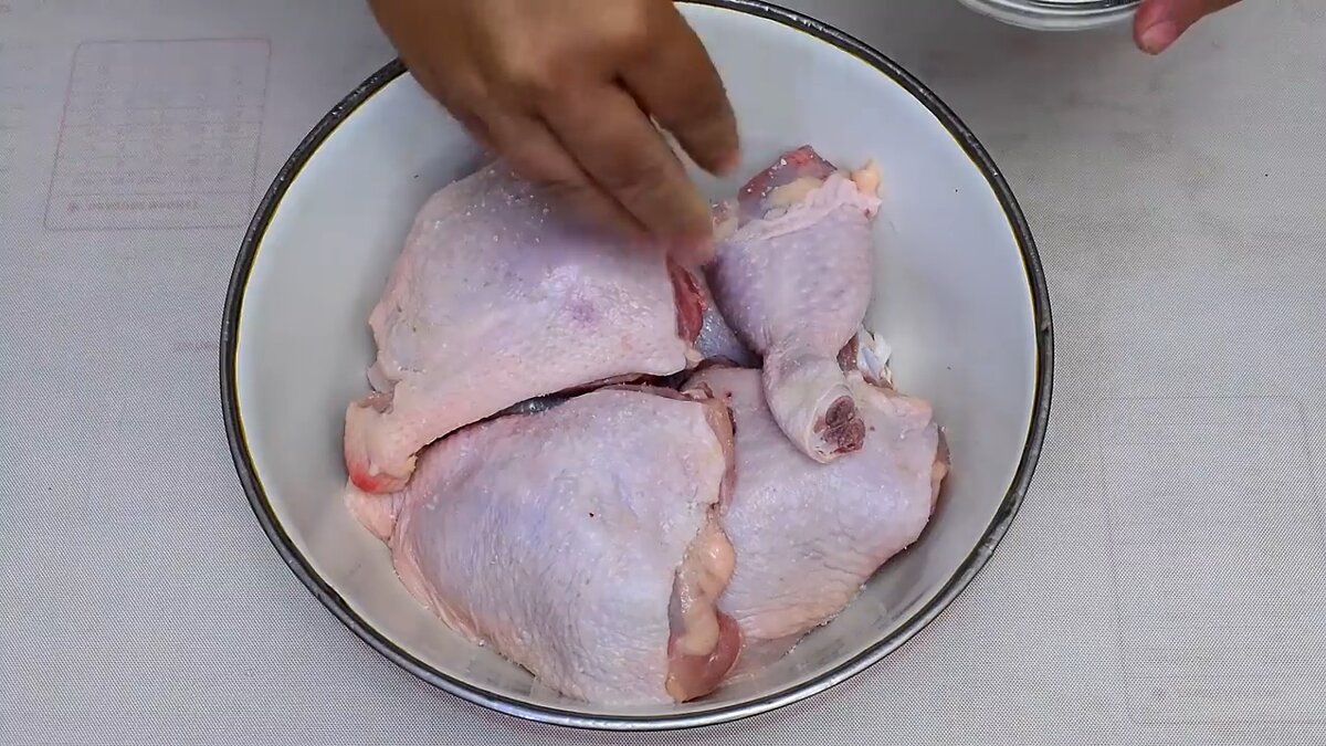 Итак, для шашлыка я взяла куриные окорочка и разрезала их пополам. Сразу скажу, гузки я не отрезаю, т.к. в моей семье есть любители гузок. Если вы не приемлите их, отрезайте смело. Первым делом мясо немного присолю, не сильно, т к в маринаде будут специи, а в специях бывает соль. Сами понимаете,не соленое мясо-это не вкусно.