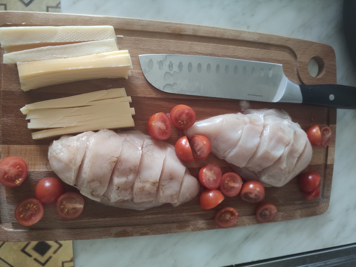 Просто, вкусно, минимум углеводов. Порадуйте свою половинку! Нарезаем сыр ломтиками и ещё раз вдоль. В филе делаем примерно 6 надрезов на 80%. Как на фото. Затем в получившиеся надрезы укладываем сыр, лист базилика и помидорку. Смазываем блюдо для запекания оливковым маслом, а также нашу грудку. Сверху добавляем соль и перец, также оставшиеся помидоры и сыр. И ставим в духовку на огне чуть выше среднего на 30 минут.