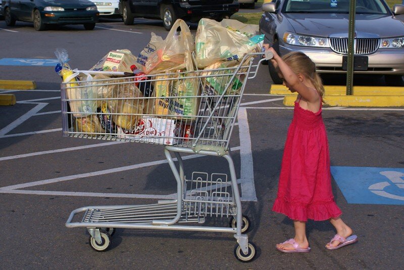 - Большая телега. Вы наверно сейчас подумали, что они думают о нас и хотят, чтобы нам было удобнее? Но это далеко не так. Если вы положите в телегу молоку и печенье, то вам будет казаться, вот чего то вы недокупили и тем самым выходите из магазина с большими пакетами. И если ваша задача сэкономить то лучше не брать телегу, возьмите лучше корзинку в нее явно поместится только то, что вам нужно.