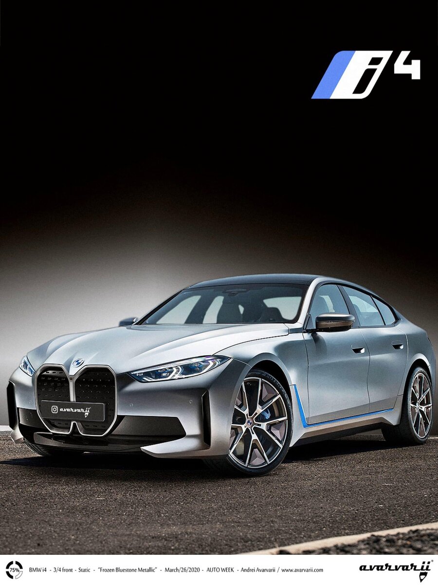 Этот новый рендеринг приближает концепцию к производственной модели. Как мы узнали от BMW, концепт i4 почти на 80% близок к реальной модели. Итак, давайте начнем анализировать этот рендер. Спереди на нем сохранена решетка радиатора концепта i4. Таким образом, расширенная решётка радиатора преобладает в передней части автомобиля, а гладкие лазерные лучи придают автомобилю дополнительную привлекательность. Передний бампер призван улучшить аэродинамику, это важный компонент электромобиля. Новейшая интерпретация логотипа BMW прекрасно сидит на капоте и сочетается с серебристым цветом этого рендера i4. BMW i4 будет поставляться с аккумуляторной батареей мощностью 80кВт, вырабатывающей около 530 лошадиных сил. Ускорение с места до 100км.ч будет занимать менее 4 секунд, а максимальная скорость составит 190км.ч. BMW i4 будет укомплектован новейшими аккумуляторными батареями, которые получили обозначение Generation 5. Вес одного модуля составит примерно 550 килограмм. В отчете упомина