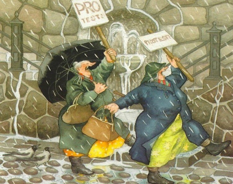 Едва ли стоит относиться к этим картинкам как к стопроцентно реалистическому искусству. Взять хотя бы ту, где две бабули сидят под столом и чокаются чашками. Но если бы они сидели за столом, картинка не была бы такой смешной. Глядя на нее, приходит в голову, что просто пожилые дамы решили вспомнить детство и забрались под стол «в домик». В комнате множество книг, в ней чисто и уютно, на столе горит красивая лампа.