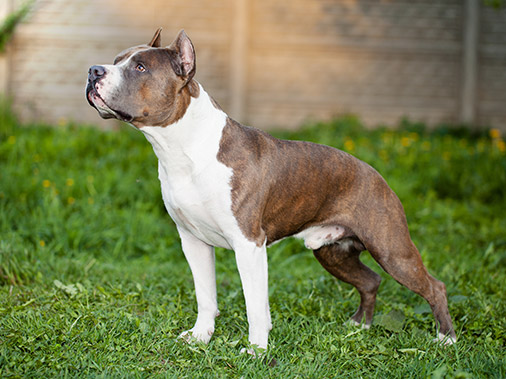 Амстафф является близким родственником питбуля, и во многом они похожи. Они произошли от общих предков менее ста лет назад, причем в разведении стаффордширских терьеров большее значение стало придаваться гармоничной внешности животных. Сегодня стандарты требуют от обеих пород уверенности, а излишняя злость или трусость не допускаются. Также считается, что амстаффы более послушны и менее агрессивны, чем питбули. Предки породы — привезённые в 1870-х годах мелкие травильные собаки Испании, Ирландии, Англии, Шотландии, Италии. С 1880 года сформировавшуюся в Америке породу стали называть «пит-бультерьер», под таким названием порода была признана в 1898 году Американским объединённым клубом (UKC). Под названием «стаффордширский терьер» порода была официально признана Американским кеннел-клубом (AKC) в 1936 году, в 1972-м к названию было добавлено слово «американский». В 1936 году американских стаффордширских терьеров и пит-бультерьеров официально разделили. FCI признала американскую поро