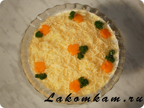 Верх посыпаем тёртым на крупной тёрке сыром и украшаем.