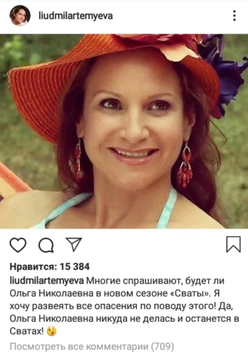 Людмила Артемьева:"...Ольга Николаевна в Сватах обязательно будет!" Все мы знаем сериал "Сваты". Сколько дебатов было о том, шедевр это или шлак? Каждый остался при своем мнении, каждому есть что сказать. Последнее время активно тиражировалась информация о съемках 7 части сериала "Сваты". Казалось бы, что еще можно сказать об этой шебутной семейке. Ведь обыграли уже и смерти, и разводы, и замужества, и субкультуры, и агробизнес.Ну просто все, что только можно. Что же ещё показать? "А вот и не все" - решили сценаристы и все-таки рискнули снять 7 часть. Конечно, такая затянутость в сроках связана с напряженными отношениями с соседним государством, и различные бюрократические препоны, вплоть до отзыва прокатного удостоверения на Украине. Но пришел к власти создатель этого сериала - Володя Зеленский- и чудным образом к съемкам приступили. Но как-то не заладилось все опять. Только отсняли локацию, как грянул короновирус, и закрылись границы, и вообще из дома нельзя выходить... Да вдру
