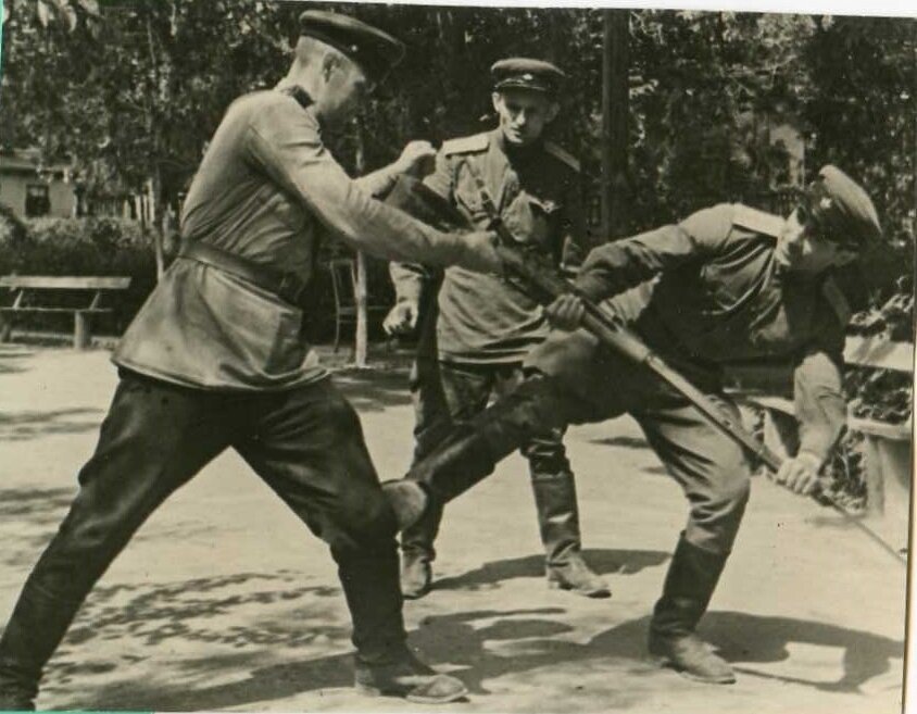 Здравствуйте, сегодня тема разговора пойдет о тренировках в военных условиях, а именно тренировка СМЕРШевцев. РУКОПАШНЫЙ БОЙ Начнем с того, что в СМЕРШЕ рукопашной подготовки уделяли больше времени чем в обычных войсках РККА, даже некоторые приемы совершенствовались именно ими. В отличие от других войск бравших за основу систему Виктора Спиридонова одного из создателя самбо. СМЕРШ использовали методику Василия Ощепокова и Анатолия Харлампиева. Главная цель СМЕРШевцев-задержать и отконвоировать противника, поэтому и приемы разрабатывались в связи с задачами. Техника "Маятника" Думаю многие слышали о данной технике из фильма "В августе 44-го"сейчас попробую описать данную технику Данная техника помогает поставить себя в более выгодное положение к противнику с целью затруднения поражения вас. Между вами и противником расстояние менее 2 метров. У противника пистолет в руке (но не направлен на Вас) а у вас в кабуре:-( Вы делая большой шаг или 2 в левою сторону (уходя с линии огня, обволакив