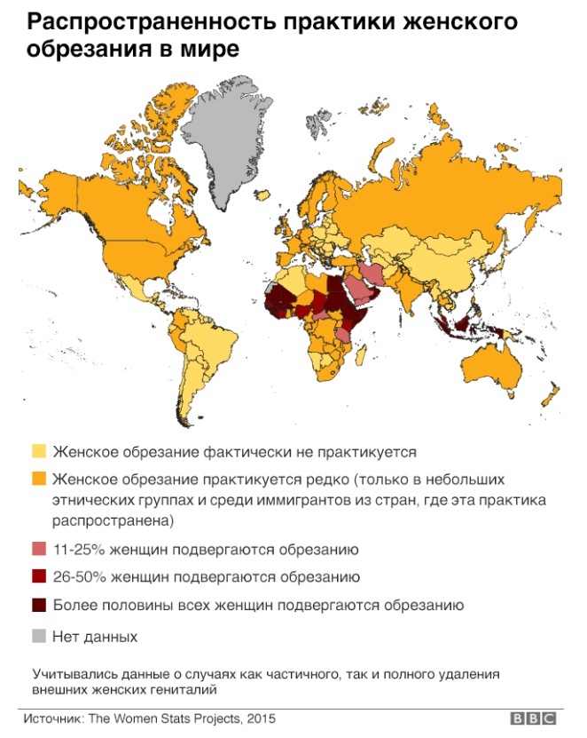 Маленькой девчонке завязают руки за спиной, закрывают глаза повязкой и ведут в операционную. Там её с силой кладут на стол, крепко держат за ноги и начинают… резать гениталии. Грязными инструментами. Без обезболивающего. Скорее всего, это вообще не врачи. Она всё чувствует и кричит, но её не слышат. Это не сюжет какого-то жуткого фильма ужасов. Это женское обрезание. Женское обрезание — это частичное или полное удаление женских гениталий по религиозным соображениям, которое проводится без медицинских показаний. Эту болезненную процедуру в медицинской среде уже давно не называют обрезанием, потому что она не имеет почти ничего общего с обрезанием у мужчин. Мужчинам удаляют только крайнюю плоть, а девушкам — головку клитора, половые губы, сшивают стенки влагалища. Её корректнее называть «калечащей операцией на женских половых органах» или «нанесением увечий женским гениталиям». Чаще всего жертвами насильственной операции становятся девочки 5-16 лет, а иногда и младенцы. Сейчас примерно