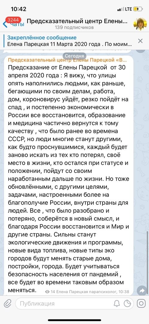 Предсказание от Елены Парецкой от 30 апреля 2020 года : Я вижу, что улицы опять наполнились людьми, как раньше, бегающими по своим делам, работа, дом, короновирус уйдёт, резко пойдёт на спад , и постепенно экономически в России все восстановится, образование и медицина частично вернутся к тому качеству , что было ранее во времена СССР, но люди многие станут другими, как будто проснувшимися, каждый будет заново искать из тех кто потерял, своё место в жизни, кто остался при статусе и положении, пойдут со своим наработанным дальше по жизни. Но тоже обновлёнными, с другими целями, задачами, настроенными более на благополучие России, внутри страны для людей. Все , что было разобрано и потеряно, соберётся в новый смысл, и благодаря России восстановится и Мир и другие страны. Сильны станут экологические движения и программы, новые вида топлива, новые типы эко городов будут менять старые дома, постройки, города. Будет учитываться безопасность населения от пандемий , все будет во времени таков