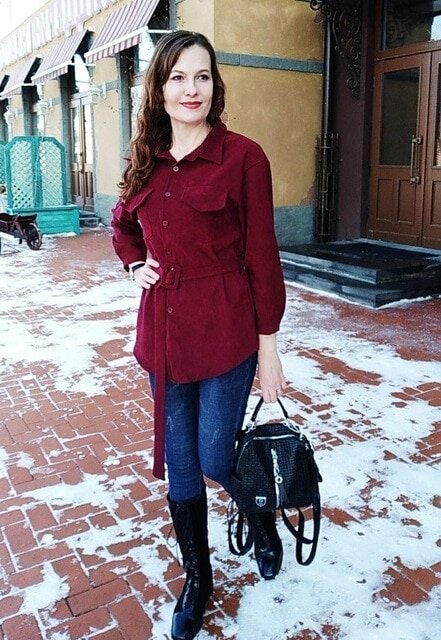 Рубашка прямого кроя из плотного, но мягкого вельвета в мелкую полоску, застегивается на пуговицы в тон ткани. Я взяла в насыщенном бордовом цвете, он очень красивый! Но на выбор есть ещё несколько интересных расцветок. Размер единый, в объеме подошел хорошо на мои параметры 90 - 63 - 90 Рубашка сидит свободно и комфортно, линия плеч немного спущена. Ссылка А вот с общей длиной беда.. Рубашка еле прикрывает пятую точку. Хотя на промо фото она должна быть до середины бедра. Рукава совсем короткие, получились 3/4 на мой рост 170 см.. Низ рубашки с полукруглым вырезом спереди и сзади, смотрится на выпуск очень красиво. Рукава буду подкатывать до локтей, по - моему так они смотрятся более выигрышно. В комплекте к рубашке есть длинный пояс с пластмассовой квадратной пряжкой, обшитой тканью. Шлейки пришиты точно на линии талии, ну хоть это в норме. Рубашка отлично сочетается с любым низом, можно носить её с джинсами, брюками и юбками.. ..в застегнутом виде или как накидку на топ, в