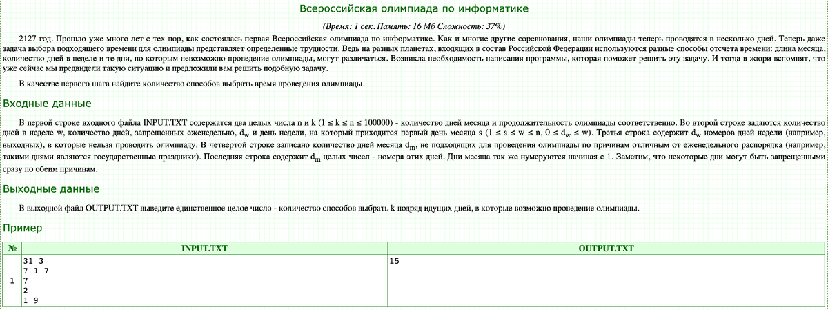Не так много задач на динамическое программирование разобрано на канале, давайте исправляться. Условие: Разнообразные входные данные, но ограничения не очень большие. Должна легко решать на языке Python. Так как олимпиада должна помещаться в один месяц, а размер месяца всего лишь до 100000, то можно завести массив такого размера и пометить все дни, в которые проводить олимпиаду нельзя. Давайте так и сделаем. Считывание первого блока входных данных очень простое: После этого идёт список еженедельных выходных, заданных номерами дней недели. Заведём список с нулями на каждый день месяца и каждый выходной пометим числом -1 в этом списке (для этого достаточно пройтись по списку с шагом w): В шестой строке есть формула нахождения первого дня месяца по дню недели. Когда в задачах встречается кольцо вычетов (вычисления с остатками от деления), удобно нумеровать с нуля. Так и я предполагаю здесь, что дни недели и дни месяца нумеруются с нуля (поэтому и список на n элементов, а не на n + 1). С р