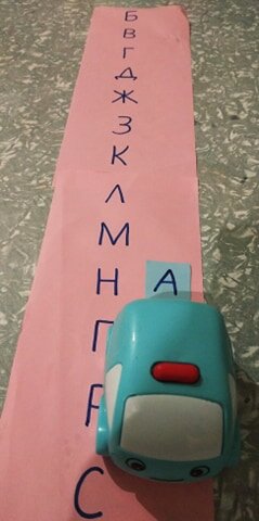 Наши дети (6 лет и 4 года) сейчас учатся читать простые слоги, состоящие из двух букв - согласной и гласной. Для того, чтобы процесс обучения чтению детям был в радость, мы используем игры. Первая игра, которая учит детей соединять согласую и гласную, мы называем "Покатай букву". Для приготовления этой игры нужны бумага, фломастер, скотч и маленькая машинка. Из бумаги мы сделали дорогу, и на этой дороге написали согласные буквы. Для начала мы использовали не все согласные, а только те, которые ребёнок запомнил хорошо и ещё три из тех, которые пока забывает. Из бумаги сделали "прицеп" и прикрепили его к машинке. На этот прицеп мы сажаем гласную букву (пишем или прикрепляем скотчем) и катаем её. Ребёнок называет слог, который получается из согласной и гласной (ба, ва, га, да, и так далее). "Буква "а" радуется, что ее прокатили, а теперь буква "о" хочет покататься", говорим мы ребёнку, и он старается прокатить и другую букву. Вторая игра, которую дети очень любят, учит не только чита