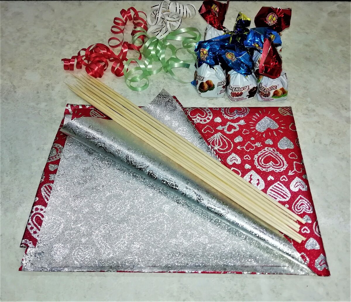 Доброго времени суток, дорогие читатели канала Важная штучка! На кануне дня рождения моей крестницы, зашла в торговый центр за цветами, и оказалось, что цветочный отдел ещё закрыт, на карантине, так сказать. Что делать? Подумала, раз она у нас такая сладкоежка, сделаю ей букет из конфет. Кой какие материалы для моей задумки у меня были дома, чего не хватало, купила в фикс прайсе. Для начала берём двухстороннюю блестящую обёрточную бумагу, средние шпажки, конфеты, скотч двухсторонний или подарочные ленты. Откусываем бокорезами острые концы шпажек. Закручиваем вокруг шпажки конфетную обёртку. Нарезаем бумагу на квадраты. Ставим конфету в середину и оборачиваем бумагой. Стягиваем лентой или закрепляем скотчем. Обматываем лентой флорис. Потом нарезаем гофрированную бумагу примерно 7см х 40см. Складываем гармошкой, скругляем концы с одной стороны. Лепесточки аккуратно, чтобы не порвать, растягиваем. Я ещё из более плотной гофре нарезала полоски для внешнего бутона, но это не обязательно. Ка
