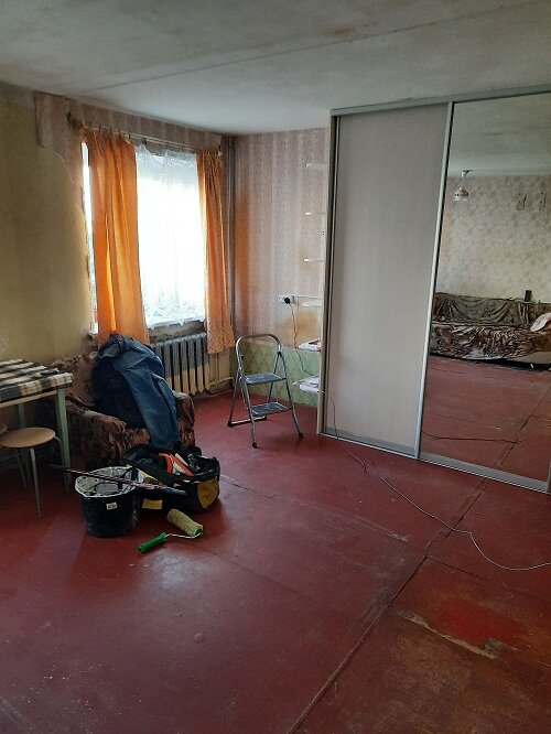 В статье расскажу, как за 3 дня привести в порядок жилую комнату в общежитии. На фото видно, что ремонт в комнате не делался со времен постройки самого здания. Единственное, заказчик установил металлическую дверь и заменил деревянные окна на стеклопакеты. Это уже большое дело, когда заменена дверь и окна. Состояние потолка ужасное и требует большого капитального ремонта, что будет очень долго и через некоторое время его придется постоянно ремонтировать. Поэтому было принято решение сделать натяжной потолок. Стены более или менее ровные, но местами требуют выравнивания и шпаклевания. Полы обшиты листами ДВП и покрашены. При замене окон, работники не обрезали даже монтажную пену и не установили уголки на откосы. Ремонт нужно было сделать за короткий срок, так как заказчица уезжала в другой город. Электрику проложил знакомый мастер. Он особо не заморачивался и проложил кабель в кабель-канале и установил наружную розетку. Хотя стена из ГКЛ и можно легко сделать внутреннюю проводк