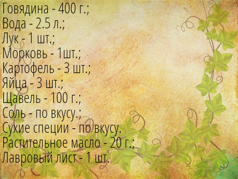 Разнообразить ежедневное меню можно необычными, яркими и очень вкусными рецептами. Одним из таких является рецепт щей из щавеля. Самое главное, что первое блюдо получается освежающим, сытным и ярким, а процесс приготовления не составит большого труда. Список продуктов Калорийность блюда 40 ккал. Как приготовить, пошагово 1. Мясо на кости необходимо положить в кастрюлю и залить водой. После закипания варить еще в течение 1 часа, образующуюся пену необходимо снимать ложкой. 2. Сваренное мясо нужно отделить от кости, а бульон процедить. Мясо вернуть в кастрюлю с процеженным бульоном и вновь довести до кипения. 3. Очищенный и нарезанный брусочками картофель добавить в кипящий бульон. Примерное время варки составляет 15 минут. 4. Для зажарки необходимо приготовить лук и морковь. Овощи нужно хорошо вымыть и почистить. Лук следует мелко нарезать, а морковь натереть на средней терке. После, овощи нужно обжарить в течение 2-3 минут на среднем огне. 5. Обжаренные овощи, соль и сухие специи доба