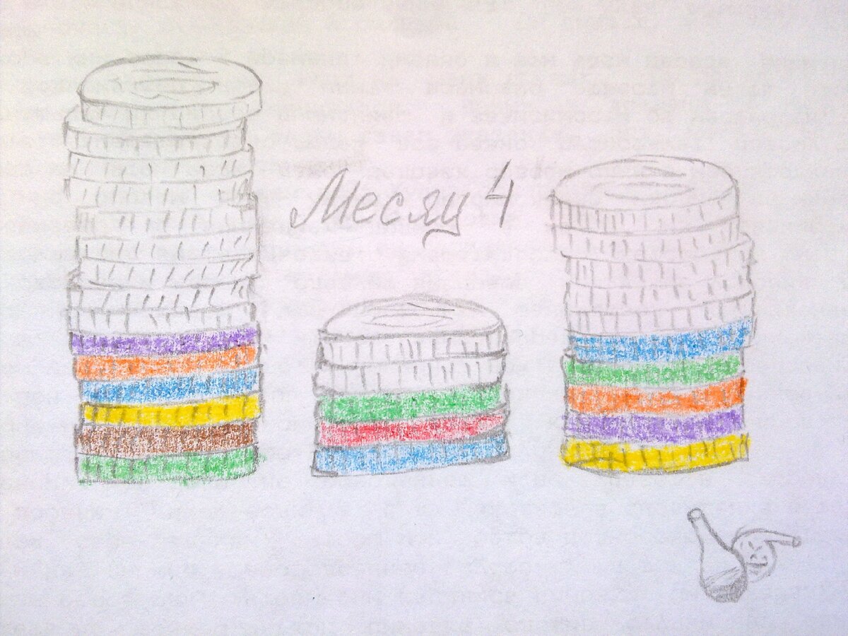 Я прошла треть своего пути. Сегодня 121 день моего марафона и ровно 4 месяца как я каждый день откладываю некую сумму в свою копилку. Ну что же, начинаю отчитываться. Как уже вошло в привычку каждый день я откладываю суммы "по нисходящей". Хотя нет, не каждый. 11 мая я так запуталась с тем, какой был день - воскресенье/понедельник - что забыла отправить в копилку сумму. Но на следующий день исправилась и отложила за два дня. Вот мои отчисления на счёт марафона: 5 числа как обычно пришли проценты по счёту - в этом месяце они составили целых 34 копейки. Каждую субботу, тоже как обычно, я перевожу накопленную за неделю на счету сумму на вклад. Суммарно за время марафона я отложила... справимся с записями: Сегодня на вклад отправилось 4403 рубля, а всего с прошлого отчета все 18200. Вот так, небольшими и почти незаметными шагами мне удалось скопить вполне приличную сумму. И ещё более приятно, что на вкладе сумма больше за счёт начисленных процентов: Два дня назад пришли проценты за этот ме