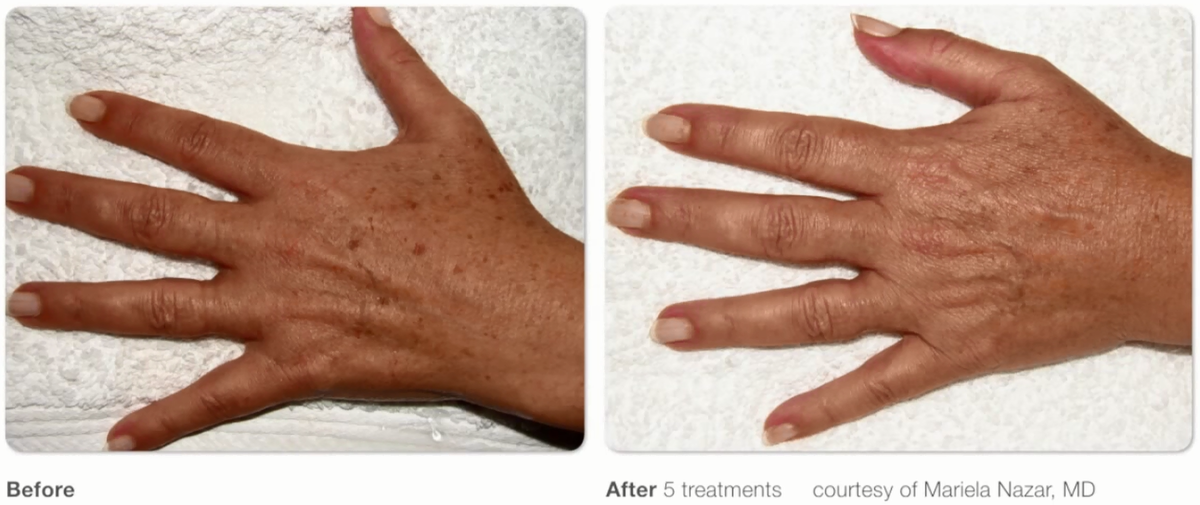 Пигментные пятна на руках — распространенный косметический недостаток. Он не проявляется болезненными ощущениями или какими-то другими ухудшениями в самочувствии. Однако подобная «пятнистая раскраска» делает руки непривлекательными, на них обращают внимание окружающие. И такой дефект в первую очередь становится проблемой внутреннего беспокойства, психологического. Вот почему люди с гиперпигментацией кожи, как правило, женщины, обращаются к косметологам за помощью в устранении эстетического изъяна. Гиперпигментация неразрывно связана с фотостарением кожи. Основной ее красящий пигмент — меланин — обеспечивает кожным покровам темный оттенок: от светло коричневого до темного. В клеточной системе эпидермиса клетки меланоциты функционально объединены между собой. Их возникновение на коже похоже на цепную реакцию: стоит образоваться крохотной темной отметине, как постепенно таких становится больше, они разрастаются. Особенно активизируются под влиянием ультрафиолета. С наступлением солнечных