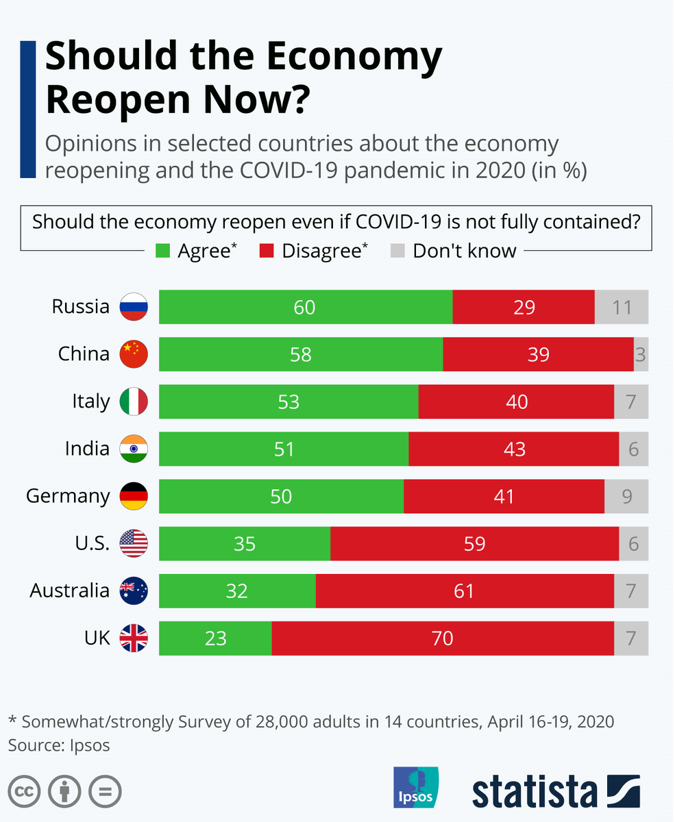 Во время вынужденной самоизоляции многие люди поняли, как же сильно они любят свою работу))) Многие уже успели соскучиться по своим любимым кинотеатрам, фитнес-центрам, магазинам. Словом, хотят вернуться в привычную жизнь. Но пока ограничительные меры по всему миру не дают этого. Ныне предприниматели вынуждены брать кредиты на то, чтобы выплатить заработную плату сотрудникам (хотя чтоб этот кредит получить - придётся серьезно потрудиться). Ну а о том, как живут люди, которые временно без работы, мне и представить себе трудно. Когда откроют экономику? Международная исследовательская компания Ipsos решил узнать мнение людей из разных стран относительно того, нужно ли сейчас начинать открывать экономику (опрос проходил в конце апреля). И....больше всего хотят на работу россияне! Целых 60% опрошенных высказались за возвращение в привычное состояние дел. И это не смотря на возрастающее количество заболевших. Иностранные аналитики назвали россиян "самыми бесстрашными". По их мнению, жители